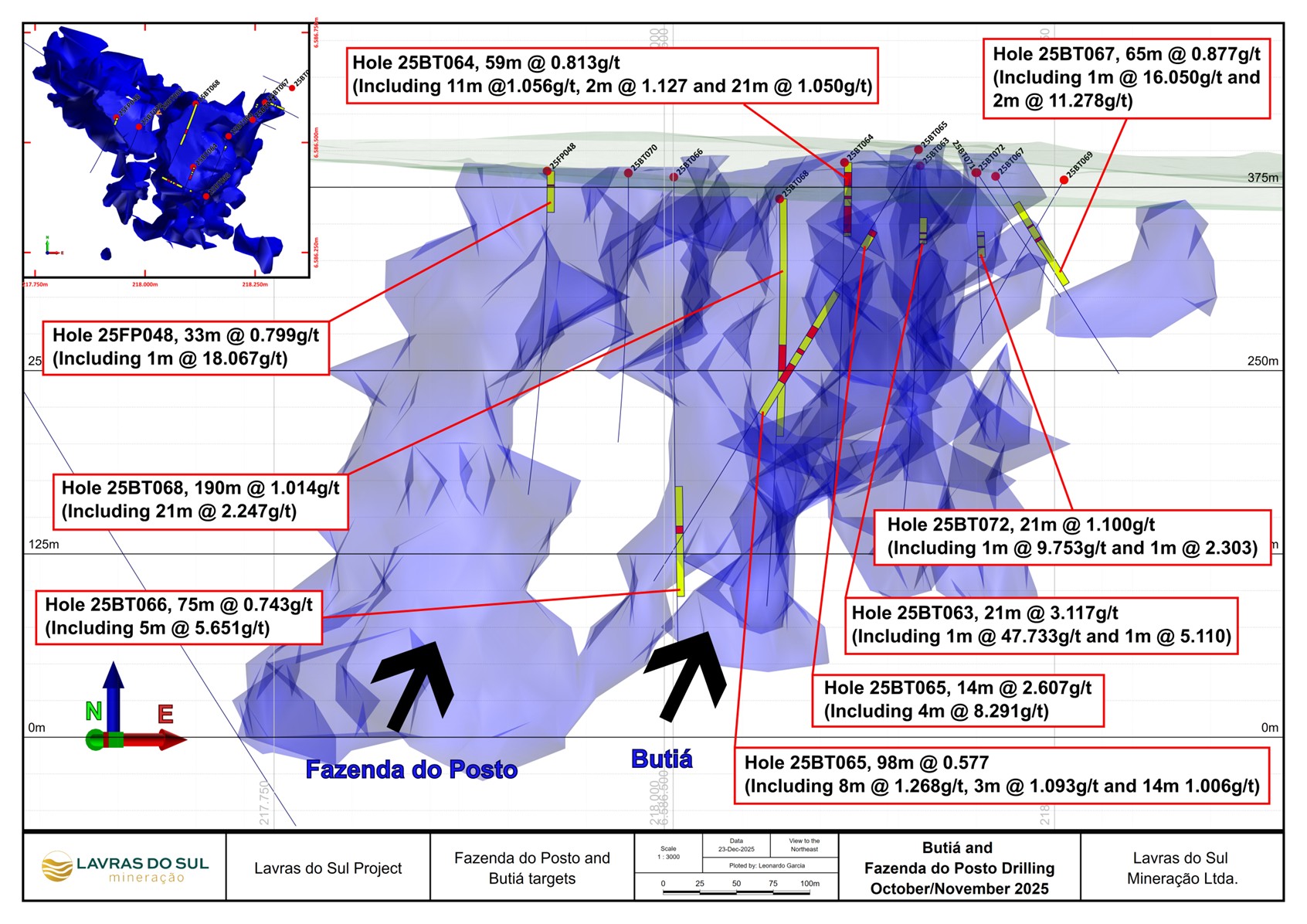Today’s results include 13 diamond drill holes completed at Butiá (10 holes) and Fazenda (3 holes) completed since the previous disclosure of drill results (see news release dated September 8, 2025), which continue to confirm the strength and continuity of the alkaline intrusive-related gold system extending across the district.